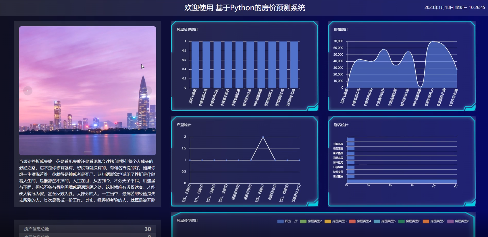 功能:本文先分析基于Python的房价预测系统的背景和意义;对常见的爬虫原理,获取策略,信息提取等技术进行分析;本系统使用python进行开发,MySQL数据库进行搭建,实现了房产的数据爬取;对数据库的查询结果进行检测并可视化分析,对系统的前台界面进行管理,分析爬取的结果