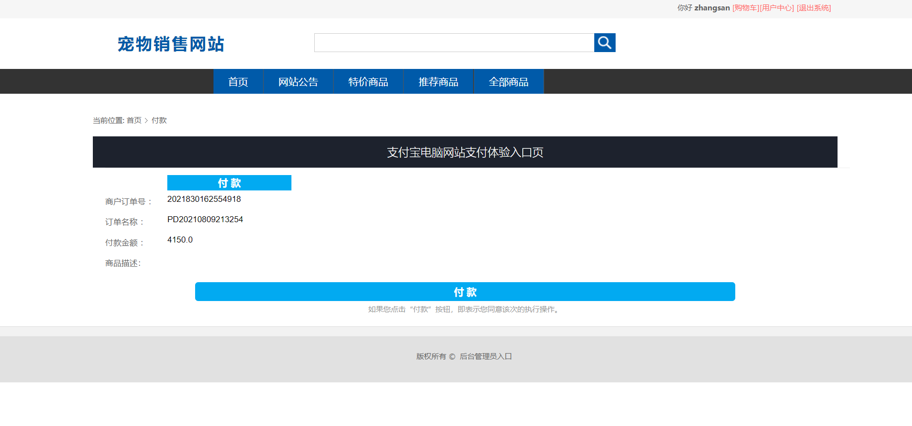 前台首页、宠物商品展示、宠物搜索、宠物分类查找、宠物详情、