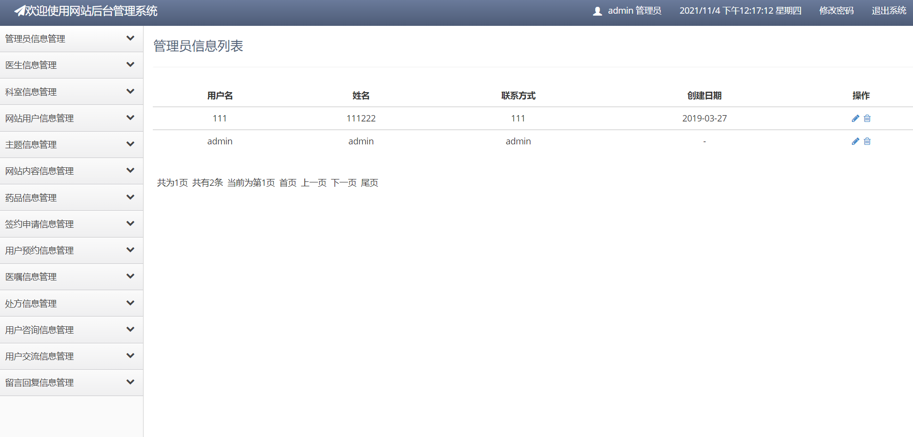 医生信息管理, 科室信息管理, 网站用户信息管理, 主题信息管理, 网站内容信息管理, 药品信息管理,