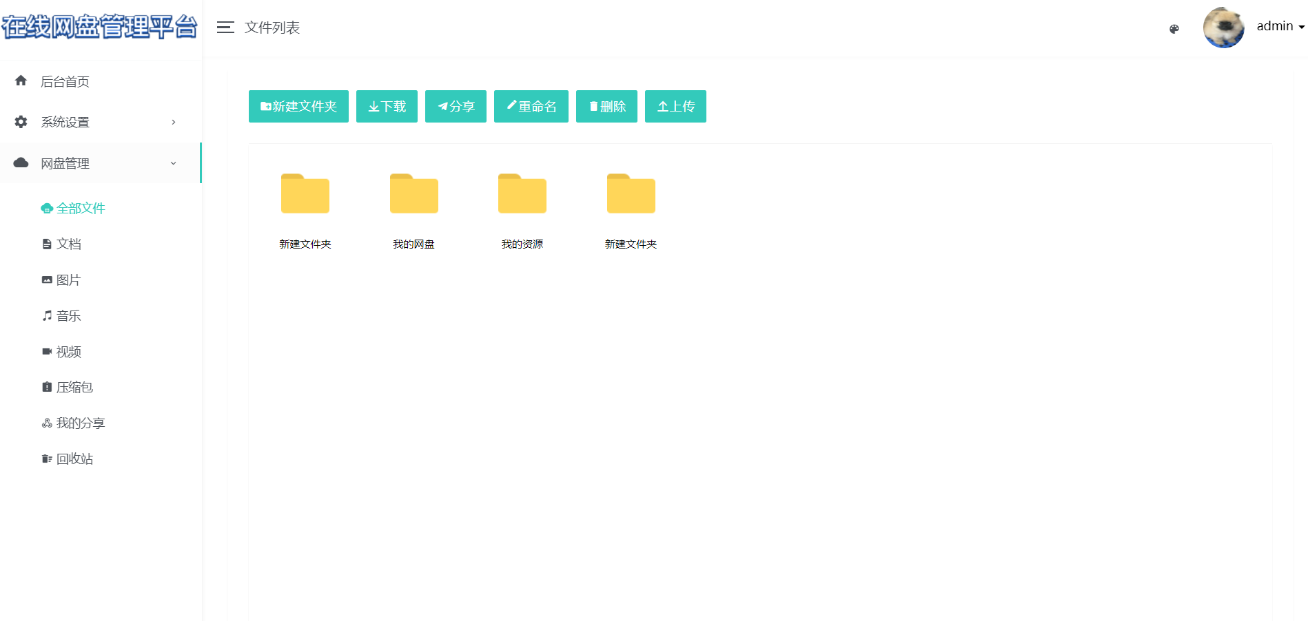 普通用户可以注册登录,注册后默认分配1G的空间大小,登录进去后可以新建文件夹、上传各种类型的文件、
