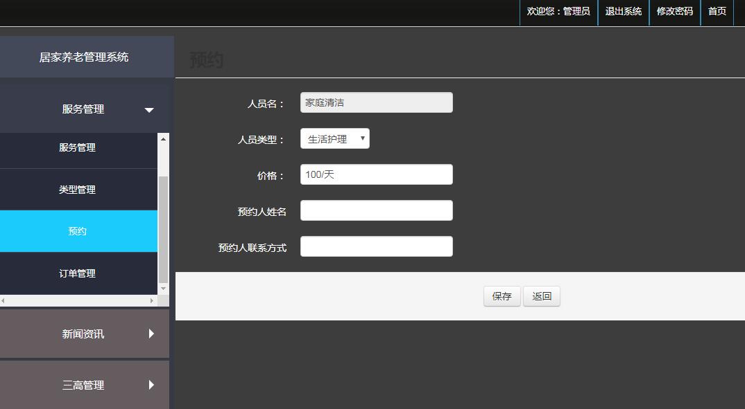 前台功能介绍:查看并搜索所有的服务信息,查看服务详情并预约、查看养老信息、查看订单、订单评价、删除订单、查看三高情况、登录、注册
