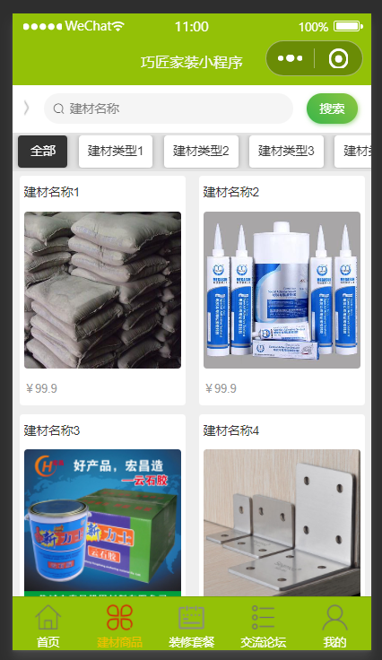 用户客户端;首页、建材商品、装修套餐、交流论坛、我的等功能