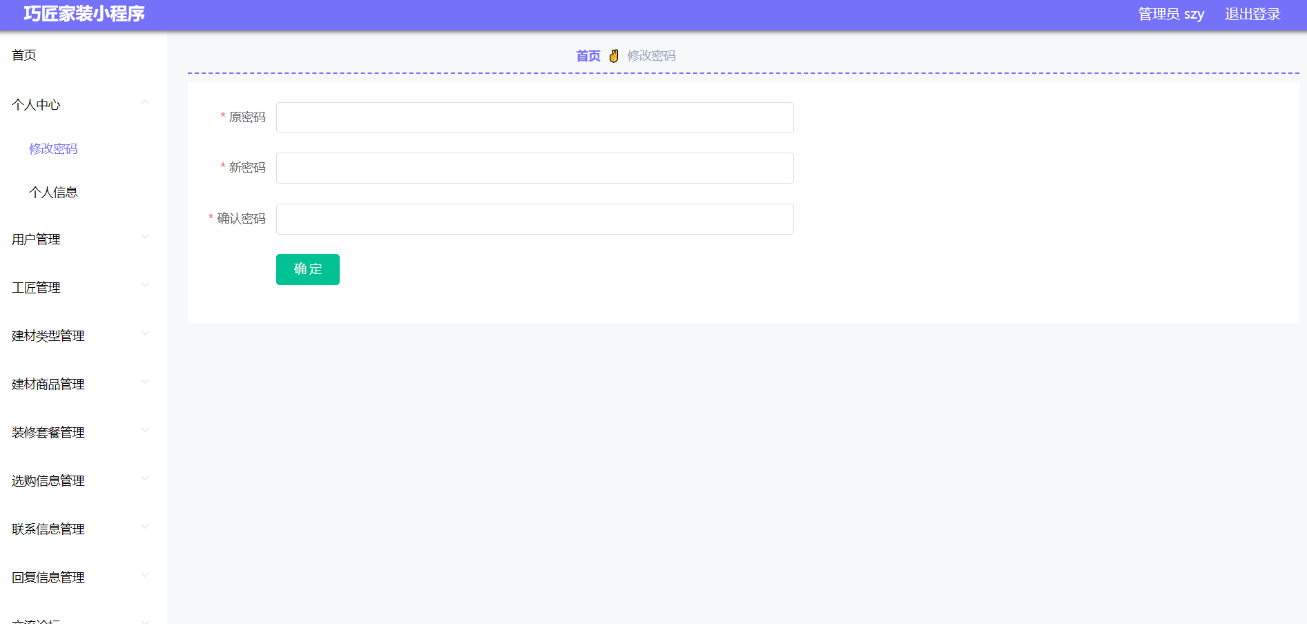 工匠服务端;首页、个人中心、装修套餐管理、选购信息管理、联系信息管理、回复信息管理,
