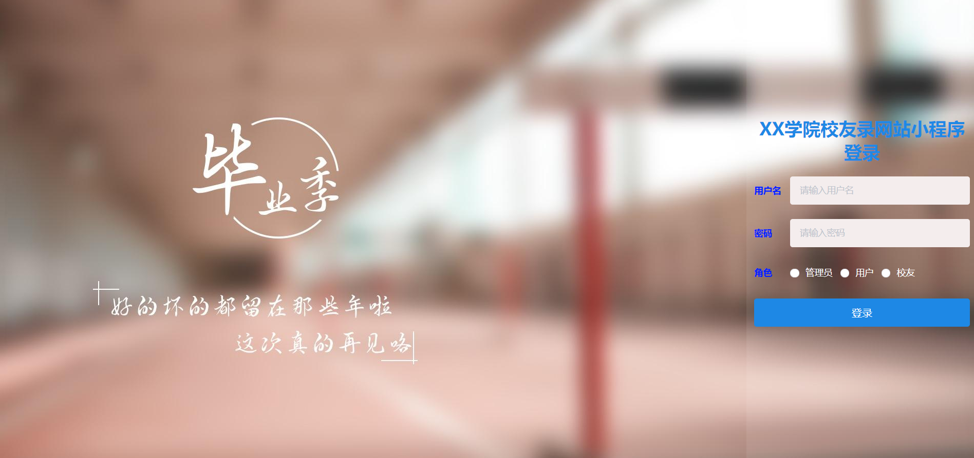 管理员服务端:首页、个人中心、用户管理、校友管理、校友风采管理、校友视频管理、 视频分类管理、班级信息管理、留言板管理、论坛交流、系统管理,