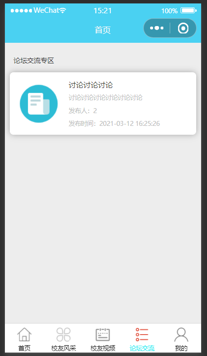 校友服务端:首页、个人中心、校友风采管理、校友视频管理,