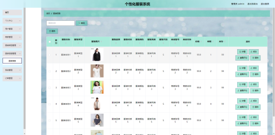 管理员:首页,个人中心,用户管理,商家管理,服装类型管理,服装信息管理,系统管理,订单管理等