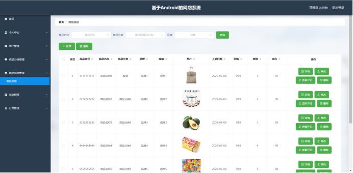 管理员:首页、个人中心、用户管理、商品分类管理、商品信息管理、系统管理、订单管理等