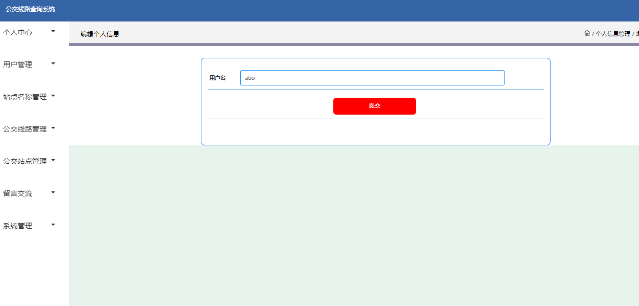 管理员:主页、个人中心、用户管理、站点名称管理、公交线路管理、公交站点管理、留言交流、系统管理等