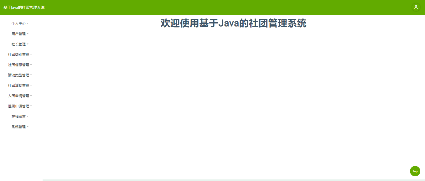 管理员:个人中心,用户管理,社长管理,社团类别管理,社团信息管理,活动类型管理,社团活动管理,入团申请管理,退团申请管理,在线留言,系统管理等