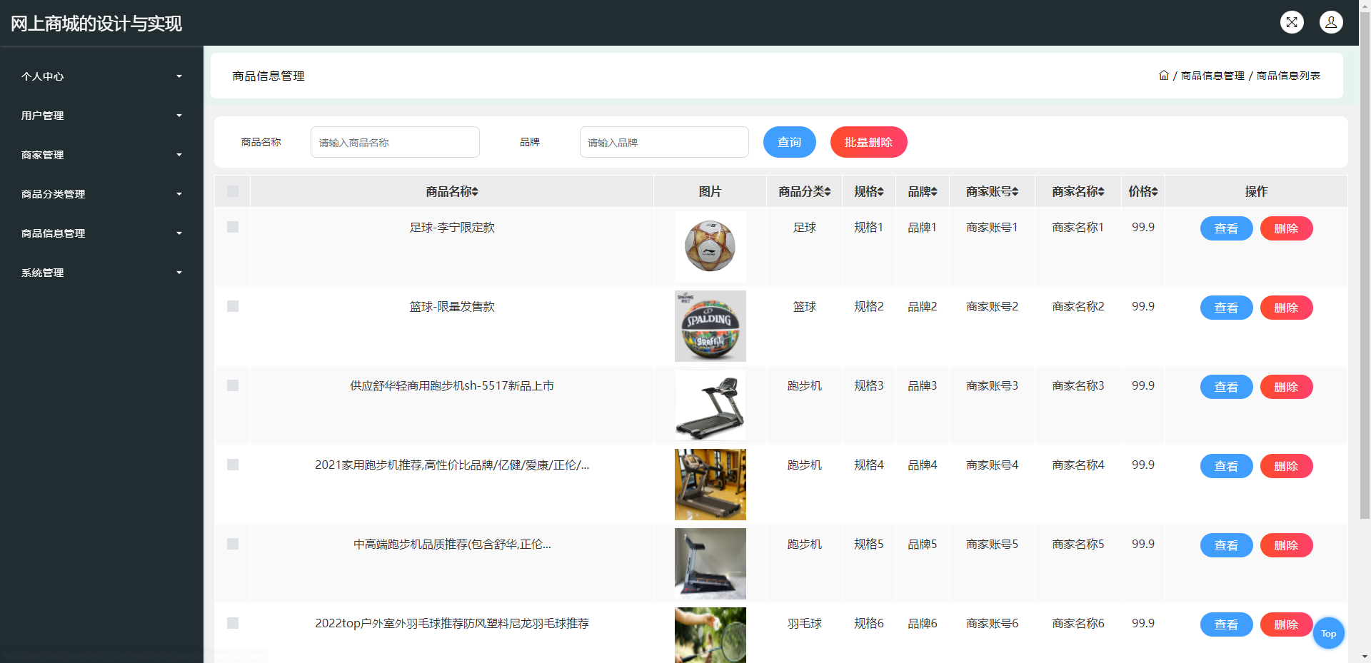 管理员:个人中心,用户管理,商家管理,商家分类管理,商品信息管理,系统管理等