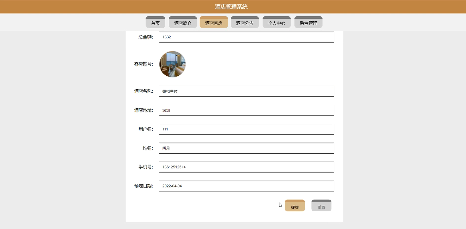 用户端功能有:前台首页、酒店客房查看预定、公告浏览、个人信息管理,登录后台可以支付客房预定费用、查看入住安排等。