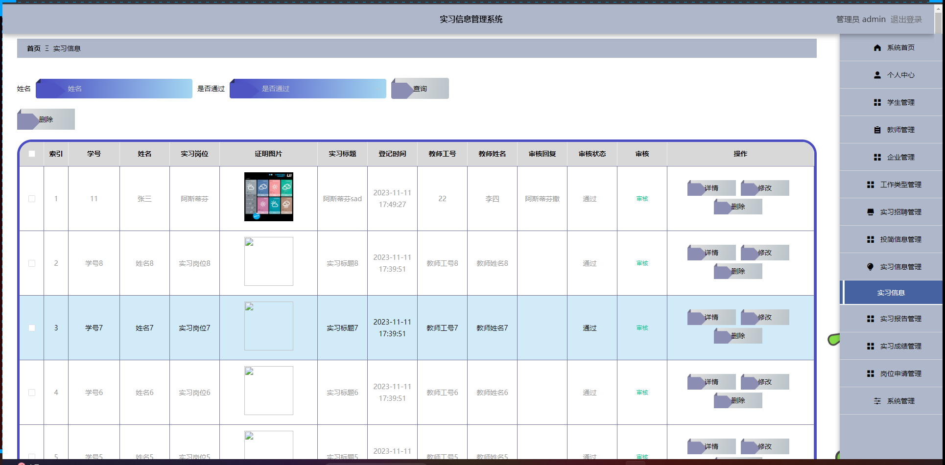 投简信息管理、实习信息管理、实习报告管理、实习成绩管理、岗位申请管理、系统管理等功能模块。
