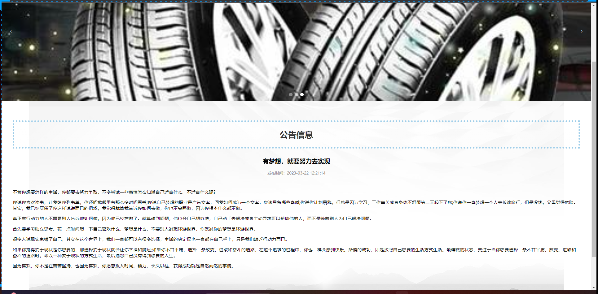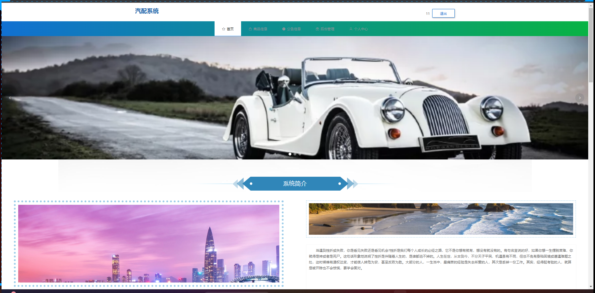 前台模快:首页、商品信息、公告信息、后台管理、购物车、个人中心、汽配系统