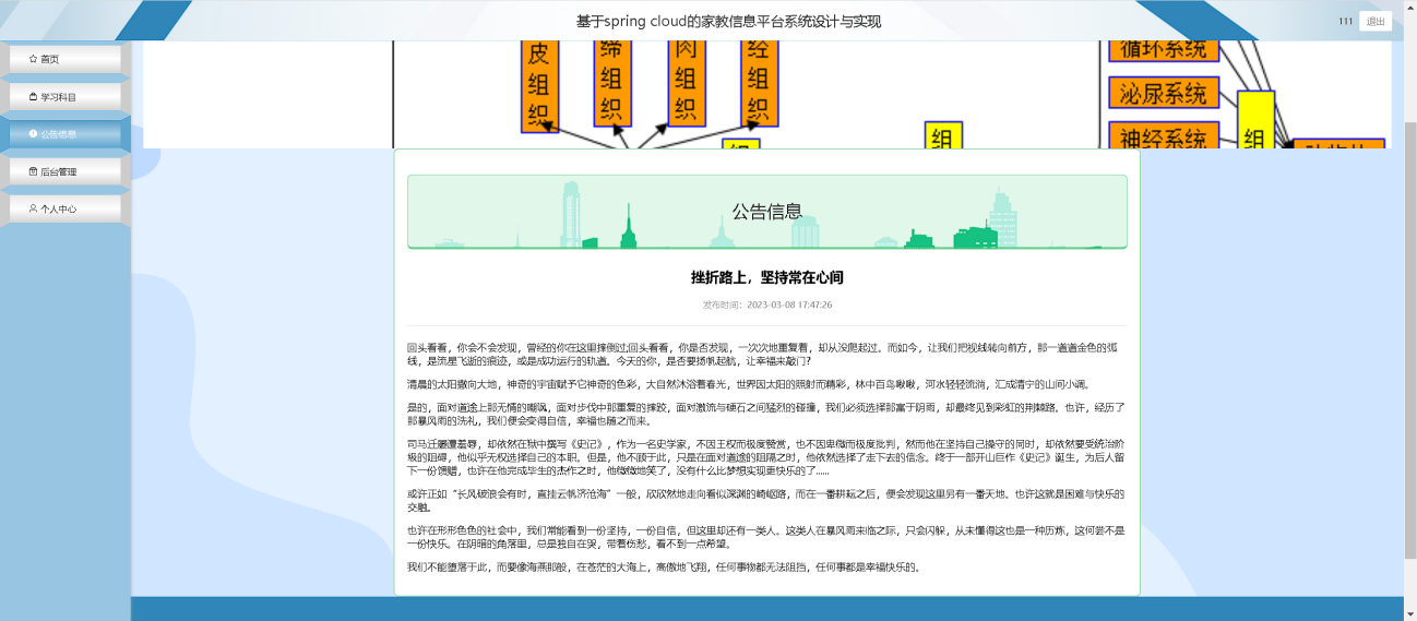 前台模块:首页、个人中心、学习科目、公告信息、后台管理