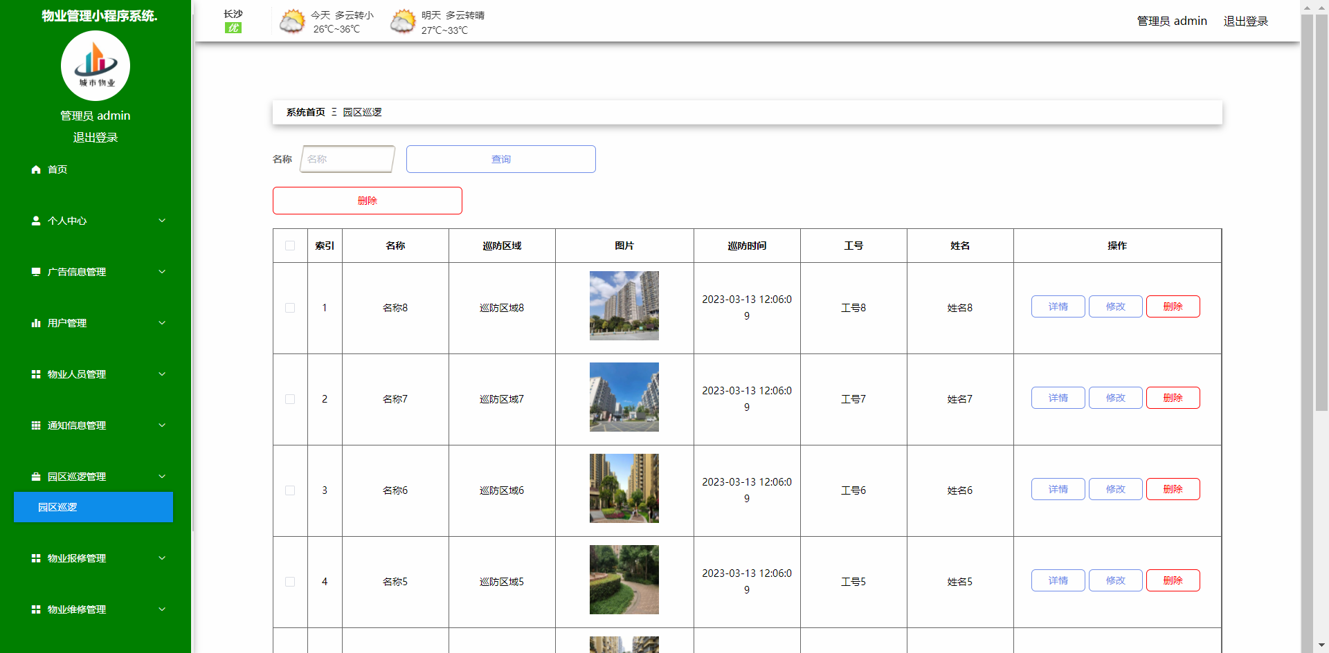 课题主要分为三大模块:即管理员模块、物业和用户模块,主要功能包括:系统首页、个人中心、广告信息管理、用户管理、物业人员管理、通知信息管理、园区巡逻管理、物业报修管理、物业维修管理、缴费信息管理、留言反馈、系统管理等;