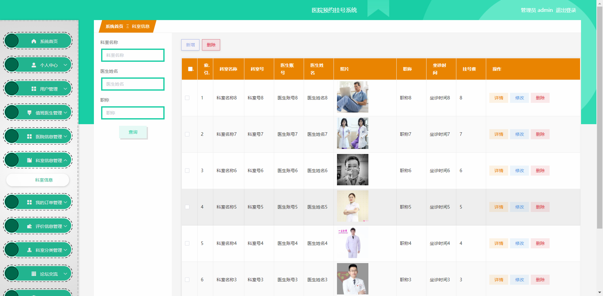 主要对首页,医院信息,我的 系统简介 值班医生,关于我们,公告信息,用户管理,医生管理,医院信息管理,值班医生管理,我的订单管理,评价信息管理,论坛交流和系统管理的实现。