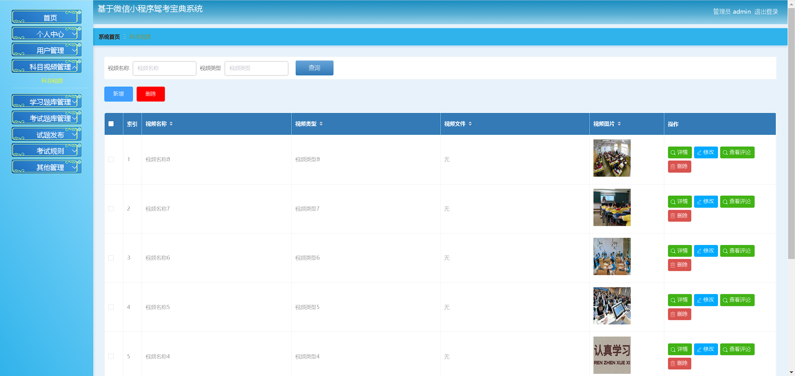 管理员可以在后台对系统首页、个人中心、用户管理、科目视频管理、考试题库管理、试题管理、考试规则、考试管理进行查看和管理。